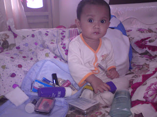 Pagi tadi, dah dia tak nak duk lam walker, i pun letaklah dia kat atas katil..sebelah papa dia yang mentidokan diri...tapi bukannya dia leh duk diam, asyik nak merayap jer...uisy..tak concentrate nak bersolek nih....asyik2 pandang belakang nak tengok dia...silap2 terjun katil lagi budak bertuah tu...so, i bagilah botol toner kat dia...nak bagi dia leka main kan...mmmm...tak jalan gak...dalam kepala duk pk, nak buat pe lagi nih...